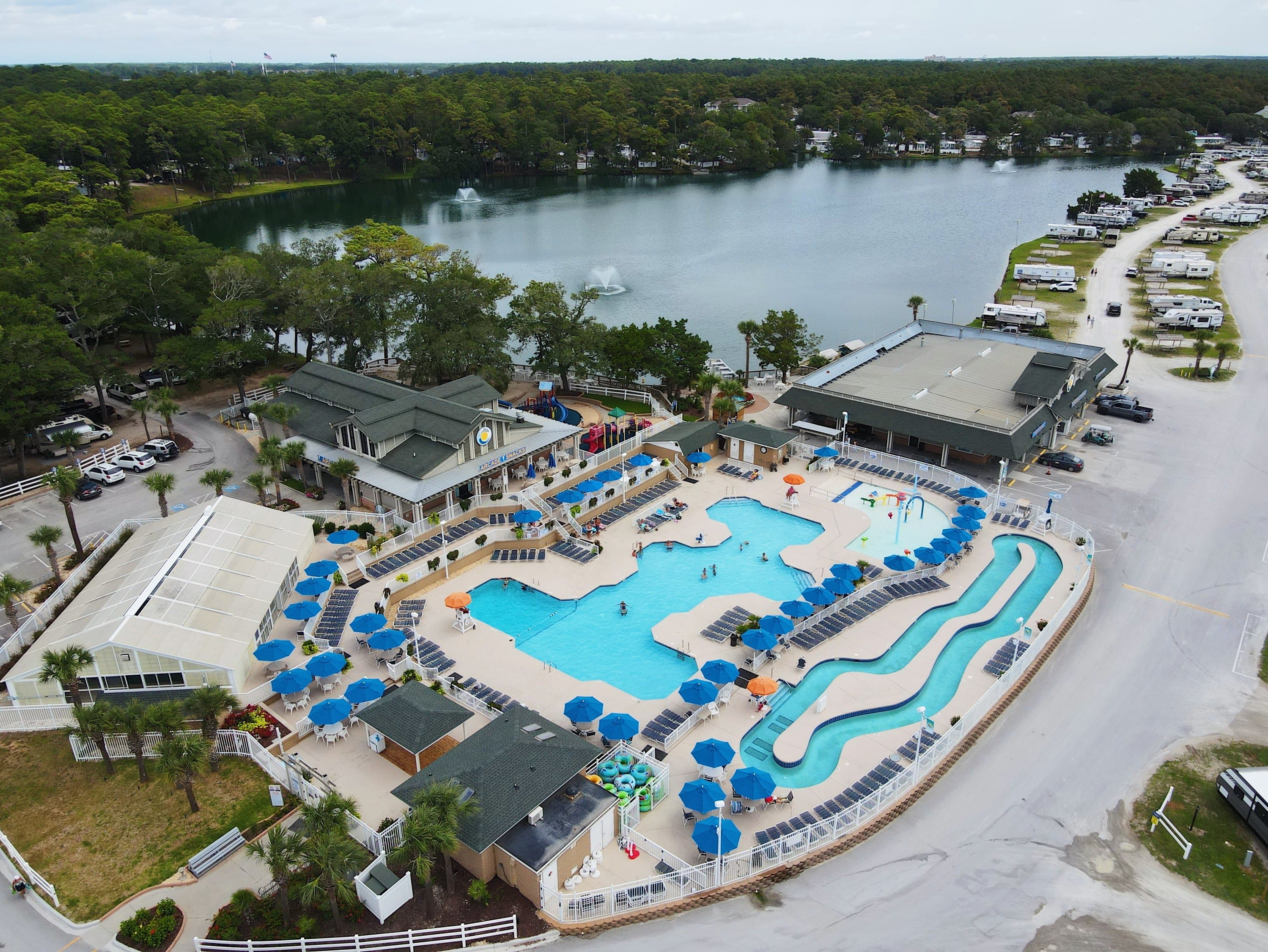 Enjoy Myrtle Beach Oceanfront camping at its very best! Choose from spacious shaded spots, lake front sites or our beach area. We have many amenities including a 17-acre lake, basketball, volleyball, horseshoes, brand new arcade & snack bar, Cafe, Breakfast by the Sea restaurant, lazy river, kiddie pool, heated indoor pool, outdoor pool, Pavilion, laundromat, camp general store, planned activities, ministry with worship services & much more! We are located on the north end of Myrtle Beach near Restaurant Row, live theatres & shopping. Directions: Between Aynor and Conway, take the Hwy. 22 exit. Follow Hwy. 22 for 27 miles all the way to U.S. 17. Immediately get in the right lane and take the Kings Road exit Turn right at the end of the off-ramp. Drive around the curve and look for our gate on the left. Please see our website www.myrtlebeachtravelpark.com for rates, activities, sales and other exciting information. Local Interests: Legends in Concert, Alabama Theatre, Medieval Times, Dolly Parton’s Pirate Voyage, Barefoot Landing, Broadway at the Beach, Brookgreen Gardens, Skywheel, Myrtle Beach Boardwalk, Carolina Opry, Family Kingdom Amusement Park, Myrtle Waves, Myrtle Beach Pelicans Baseball, Ripley’s Aquarium, WonderWorks, Tanger Outlets….